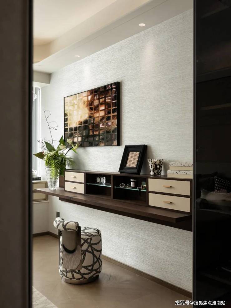 繁忙工作之余,漫步于 艺术品展览区,柔和的 米色调与木质材质,更添一份静谧而包容的从容雅致。