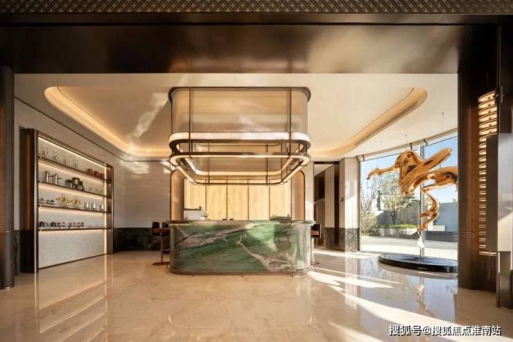 镂空的金属纹理,翠绿色大理石纹,为空间增添层次感。 大型花艺作品《嘉禾》,以黄金果、竹子、蝴蝶兰为花材,展现草长莺飞的春日景象,赋予项目庭盈福瑞的美好寓意。