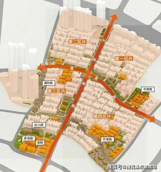 第三片区:以蓬莱路市场、凝和路商业街以及幼儿园、养老院、医院为公共服务配套的居住组团