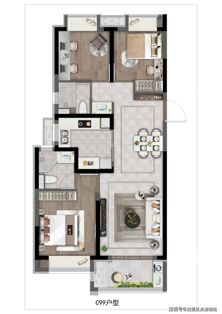 约99㎡3房2厅2卫,边套户型,做到了双开间朝南+南北通透+主卧套房设计+卫生间干湿分离+全卧室带飘窗,这个户型的附加空间非常足。