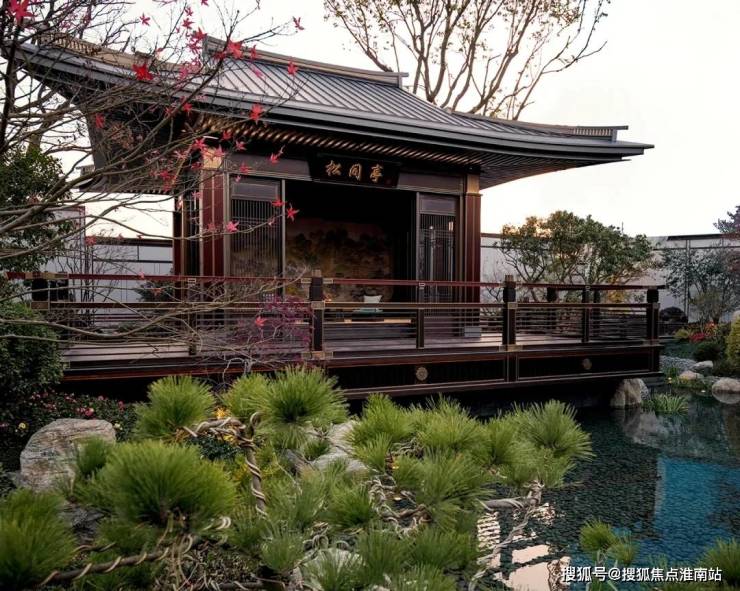 项目采用三段式入户:一进辋川入画(主入口空间),二进:闲庭碎影(戏台庭院),三进:临风听湖(自然庭院)。入户大门屋顶采用唐代“重檐歇山顶”形式配上台基上的唐代建筑标志阑干,入院后有一副唐风画作,其次以亭台楼榭、理水叠山的中国园林意境,重现盛唐大明宫百花争艳,小桥流水,落叶如金的景观。社区景观层层递进,让住户置身其中,体验唐风山水。