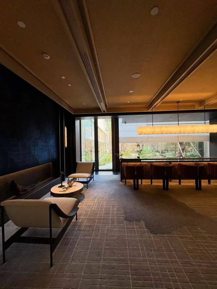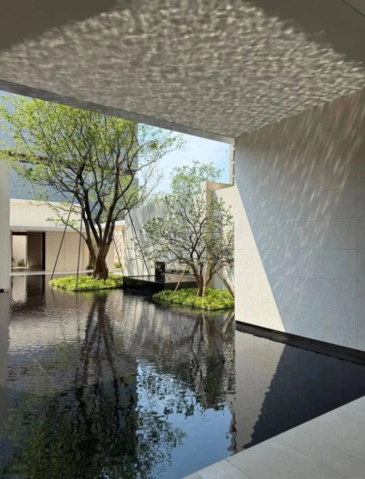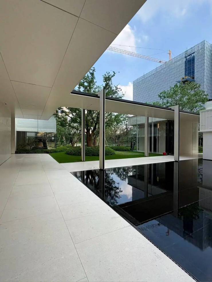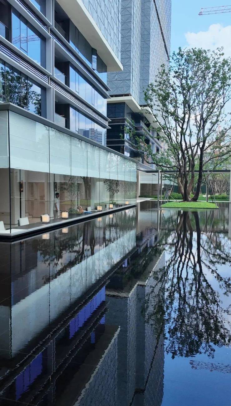 园林设计上则更偏酒店化,以希腊安缦卓熠为灵感,整个核心区园区以约900方的无界中央水景为主体。穿过大门后,约900㎡的无边界水景豁然眼前,建筑、回廊与树丛仿佛凌波而立。正如“美人在骨不在皮”,无需繁复修饰,大尺度空间、开阔水院与大面积玻璃自成画布,任自然光挥洒,这才是内蕴的性感。最是没的是在11号楼架空层的邻里中心——窗沿与水院浑然一体,桌案几乎与水面持平,微风拂过,涟漪便从眼前漾开。庭院里的丛生乌桕,不事雕琢,保留原生枝条的疏朗与错落,尽显自然之美。