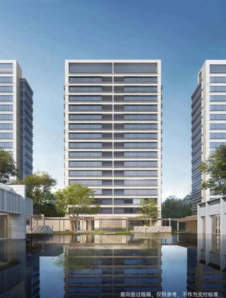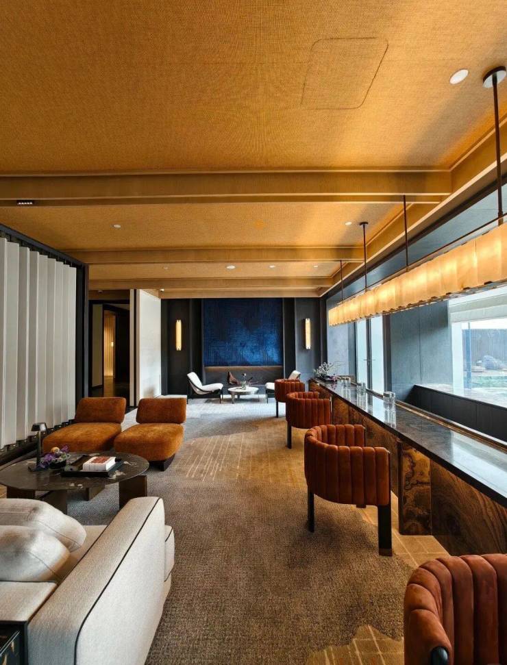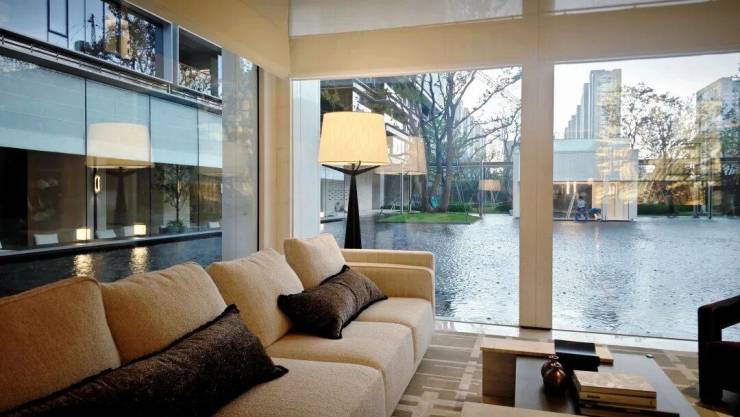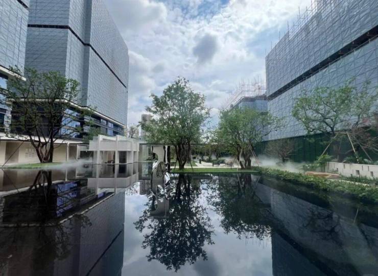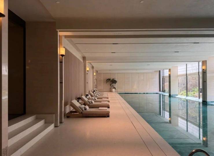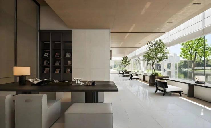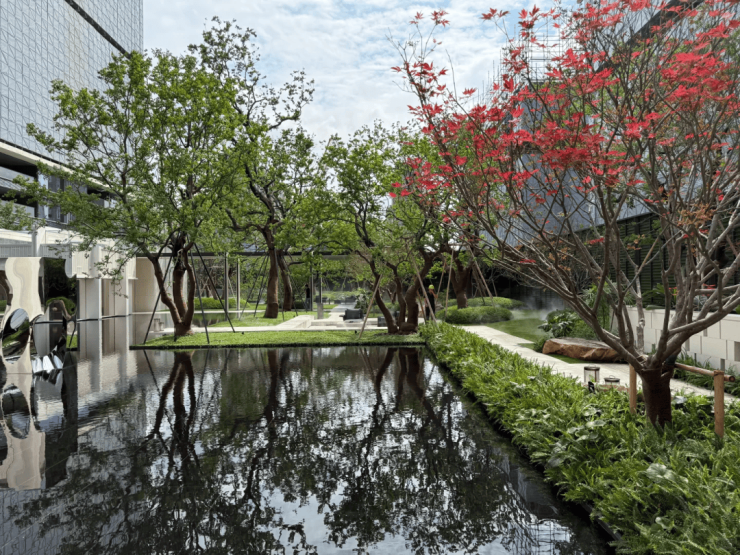 园林设计上则更偏酒店化,以希腊安缦卓熠为灵感,整个核心区园区以约900方的无界中央水景为主体。穿过大门后,约900㎡的无边界水景豁然眼前,建筑、回廊与树丛仿佛凌波而立。正如“美人在骨不在皮”,无需繁复修饰,大尺度空间、开阔水院与大面积玻璃自成画布,任自然光挥洒,这才是内蕴的性感。最是没的是在11号楼架空层的邻里中心——窗沿与水院浑然一体,桌案几乎与水面持平,微风拂过,涟漪便从眼前漾开。庭院里的丛生乌桕,不事雕琢,保留原生枝条的疏朗与错落,尽显自然之美。