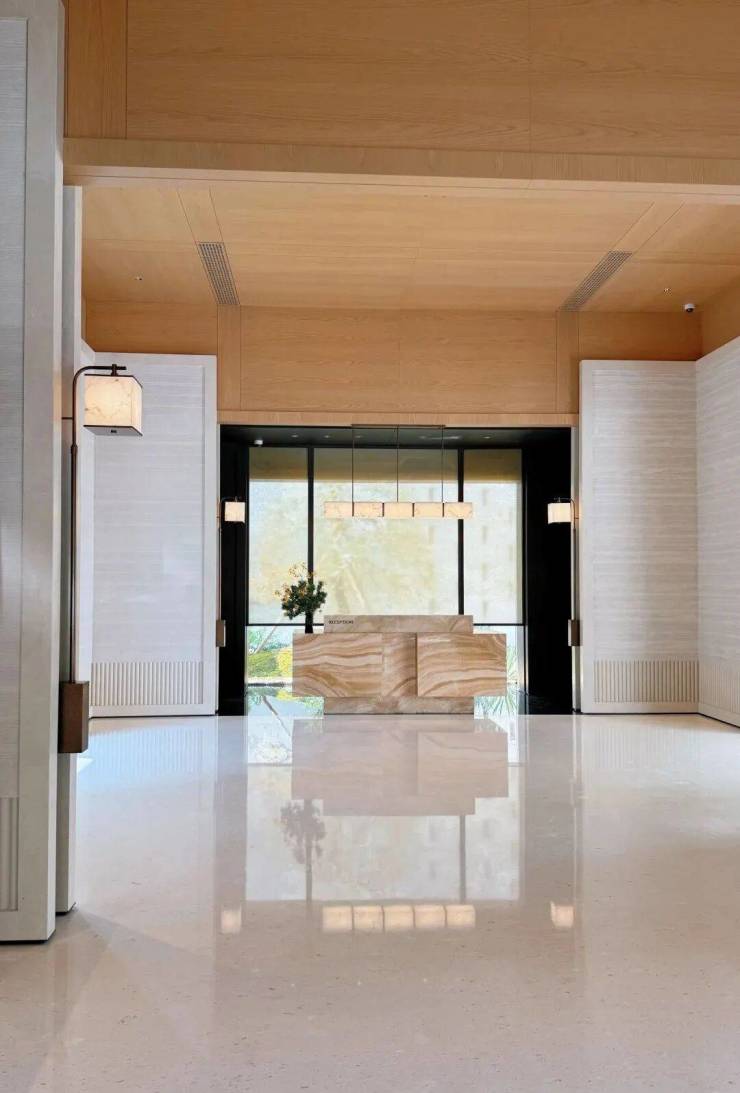 安璞的建筑立面,同样以其卓越的审美理念惊艳亮相,高层外立面以中式对称美学为基底,横向延展的铝材线条与大面积玻璃,赋予楼宇轻盈飘逸的视觉感受,实则坚固稳固,彰显空间容量而非体积感。南立面尤为惊艳,石材的厚重、玻璃的通透、均釉陶砖的温润,三种材质刚柔并济,在0.618黄金比例的精准统摄下,交织出极具艺术张力的奢华气韵。铝板、陶砖与石材的精妙结合,不仅保留了现代线条的轻盈,更通过陶材的温润光泽和石材的沉稳质感,营造出富有层次的艺术魅力。