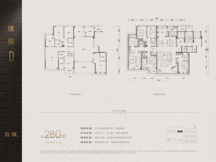 280㎡户型配置6房三套房及保姆间套房,20米面宽带来开阔视野,超30㎡主卧套房兼具私密与尊崇,尊贵感尽显!