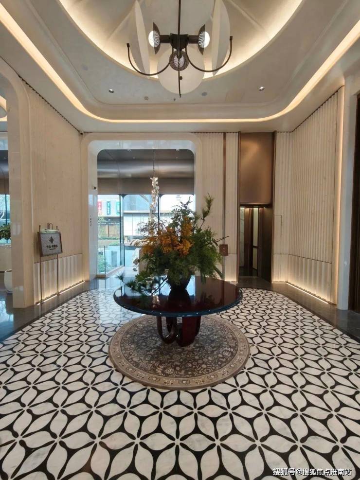 从接待台开始,就能看到小区的整个用料都是非常扎实的,墙面用了石材波纹,地面则采用了白玉兰花瓣样式的拼花,来突出海派设计语言。