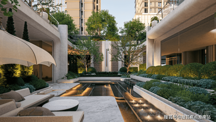 下沉式会所约1200㎡,配置恒温泳池、健身空间及私宴厅,结合水景与绿意,营造度假式生活场景。