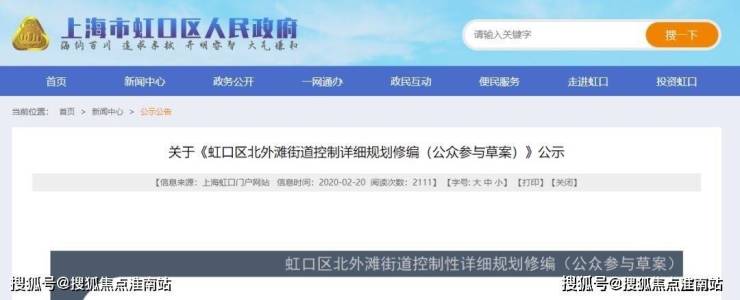 2020年2月20日公示了关于《虹口区北外滩街道控制详细规划修编(公示参与草案)》,要将北外滩建设具有全球资源配置能力和国际竞争力的顶级中央活动区!