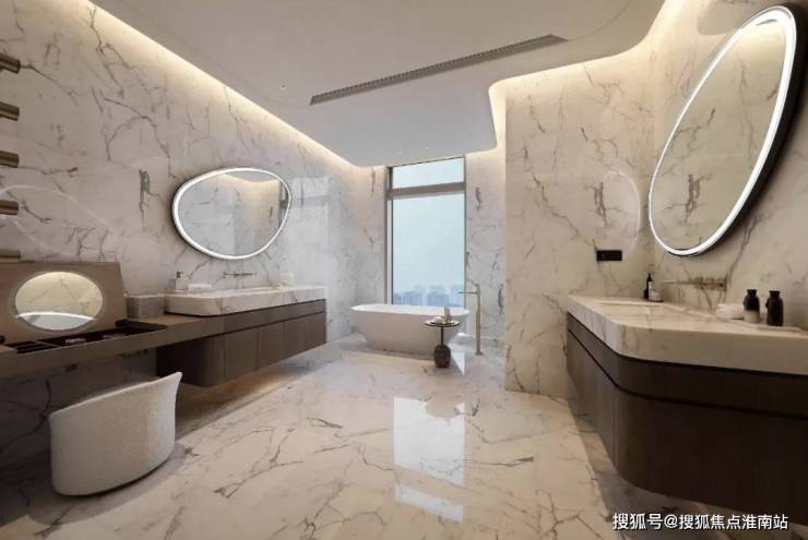 大尺度的高效利用,也让EIC大平层呈现出更多超越此前的空间享受。南向三个套房,24米的开间,停得下4辆加长林肯。进入主卧,罕见的主卫双开门设计,比一般人的主卧都要大,鱼肚白通顶,劳芬捷仕满配,甚至连公卫都是劳芬智能马桶,在这里泡澡,根本不用考虑窗帘。