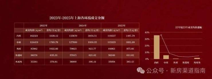 从近三年上海成交数据看,中外环以及外环外成交价格基本保持稳定,内中环稳步上涨,唯独内环内呈现跳涨态势。数据显示,内环内新房成交均价从 2023年约11.9万/㎡跳涨到2025年约16.23万/㎡,三年涨幅达到36%。