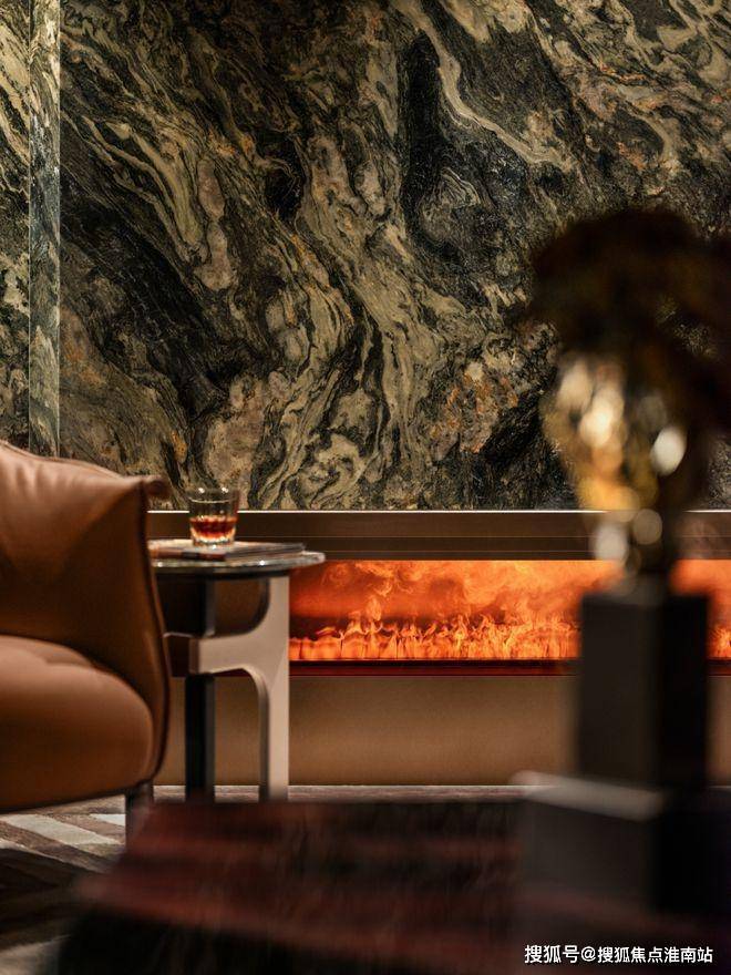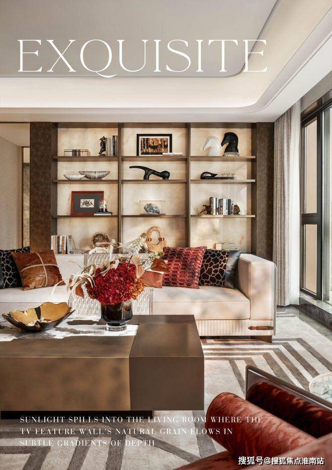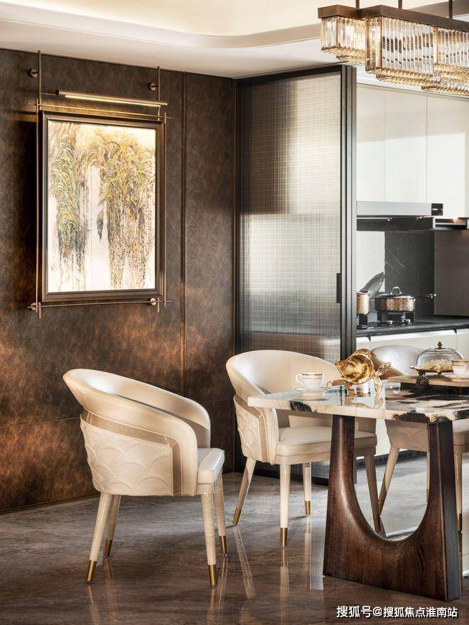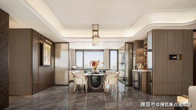 窗外沙湖波光粼粼,暖棕柜体与酒柜石材自然过渡,在空间里雅奢交融。