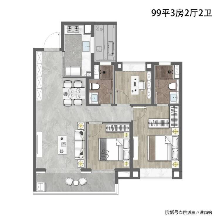 建面约99㎡3室2厅2卫户型,做到了三开间朝南+超大阳台+动静分离+主卧套房设计,延伸了室内实际可使用面积,采光、通透性都非常不错。