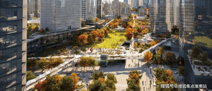 项目占据北外滩核心区稀缺的规整地块,充足的地面体量,让绿城有底气跳出 “向下拓展” 的常规思路,转而将景观资源向空中延伸,打造 “一层+二层+局部下沉” 的三重立体游园体系