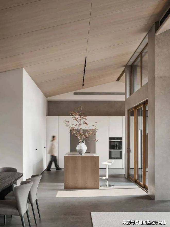 倾斜的吊顶和特意做出的错落 “断层”,增强了空间的纵深感。这种感觉不是来自单一方向,而是四面八方的张力共同形成的。