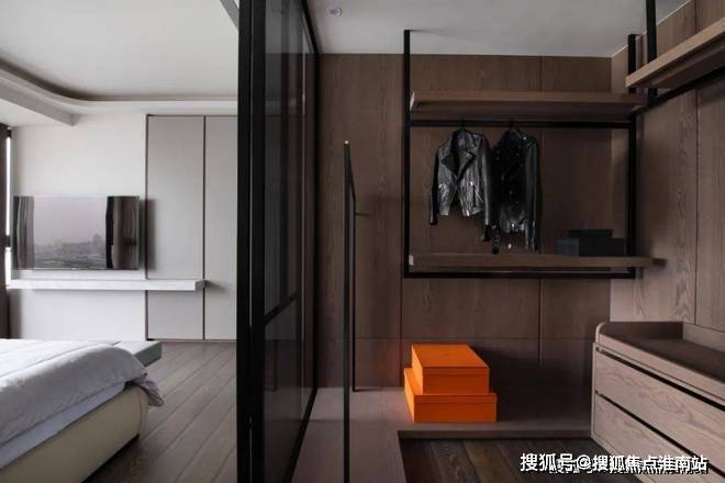 ▲玻璃隔断后的衣帽间,整体以木饰面为墙面背景,让空间更加干净而温馨;开放式的衣帽架设计为主,提供了一个方便灵活的衣物收纳存放位置,布置抽屉也是让小件物品更加方便存放与取用。