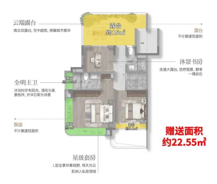 边户采用转角飘窗设计,相比中间户单价溢价约2600-3800元/㎡,折合总价约32-48万元