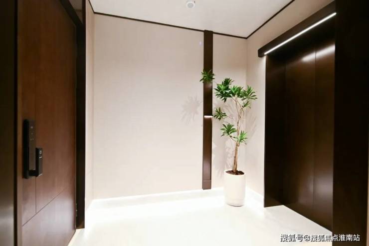 颇具质感的暗色系电梯和入户大门,与浅色墙体形成了强烈的色彩冲击。