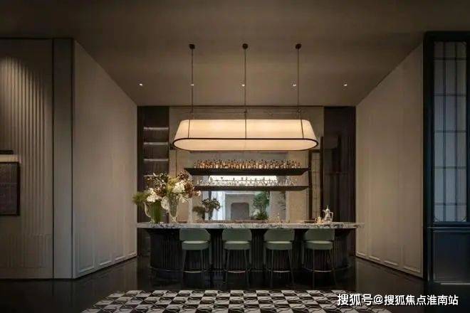 黑白交织的网格地块将“步入其中”的质感体验表达得更加生动而有韵律。入口处的吧台作为空间的基石,沉稳的翠意散发着生命力,起到承上启下的关键作用。