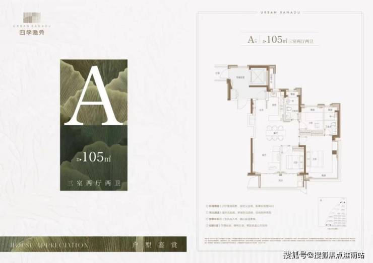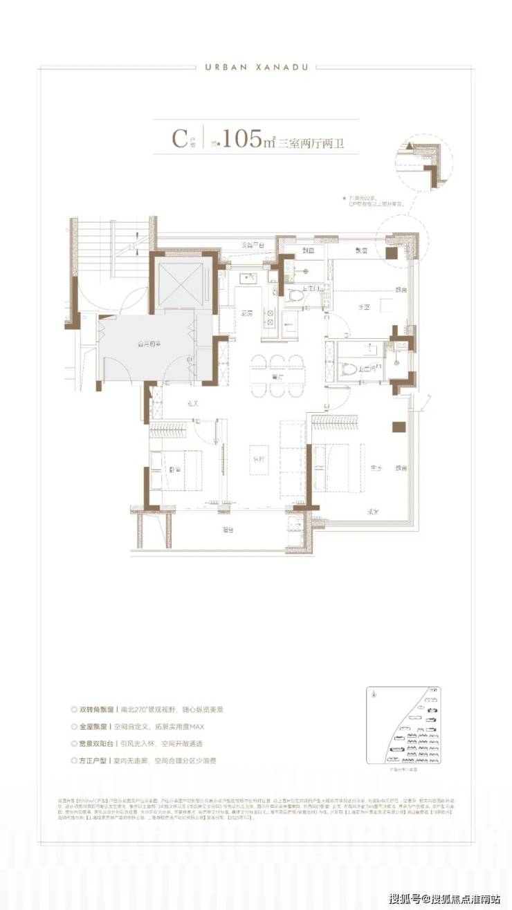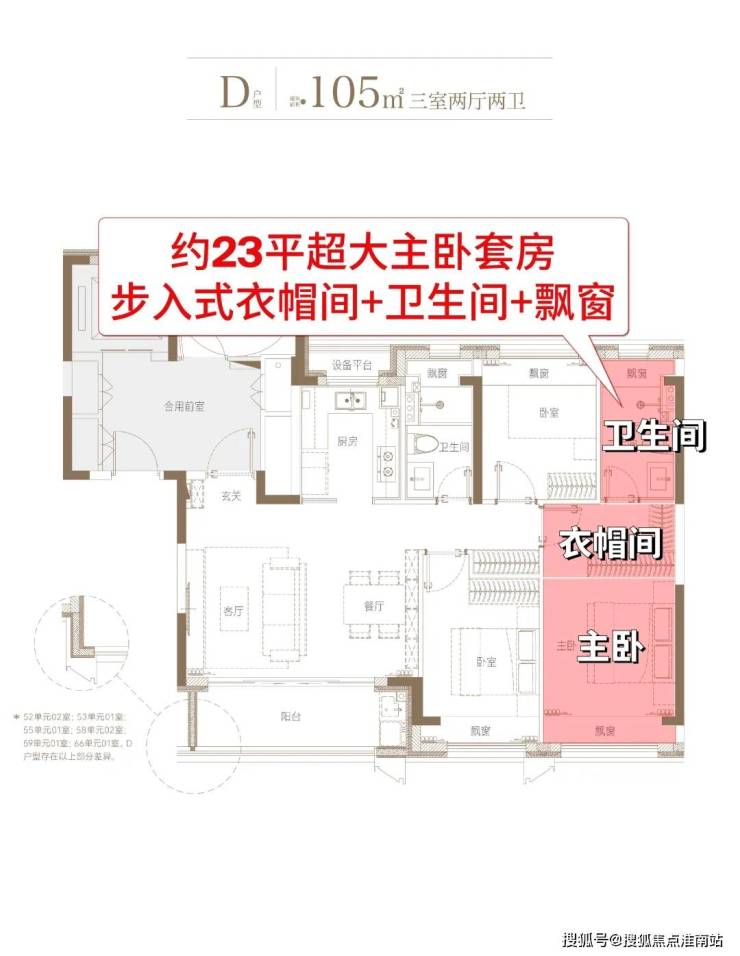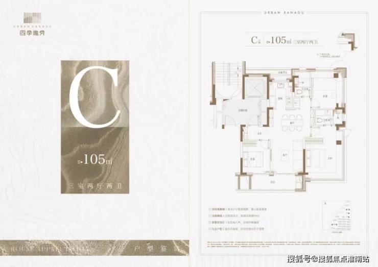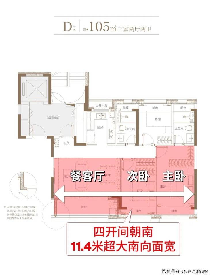 我们重点来看主力的建面约105㎡3房2卫户型: