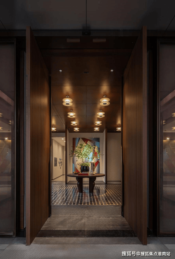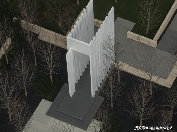 穿过公园进入社区前场,仪式感铺面,类高奢酒店设计,约10米高的「精神之门」矗立。