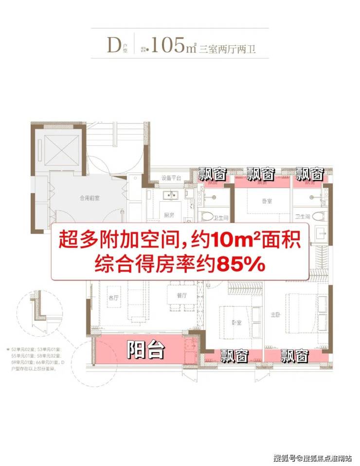 整体约10㎡附赠面积,综合得房率约85%。