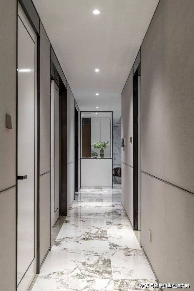 时舟里开发商预约热线:400-8567-334✔✔杭州时舟里官方售楼处电话☎:400-8567-334✔✔✔透过鞋柜看向过道,门全部做了到顶的处理,中间的腰线在公共开放区域是整体贯穿的元素,并结合柜门的开启高度,硬包的中线高度等等做了一个整体的联系。