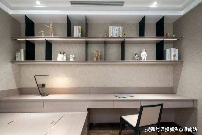 书架的灯光选择前出光可以有效的照明书架上的物品,上层的是结合顶部的灯带,桌面上由于有这条灯带的照明也有柔和的光源。