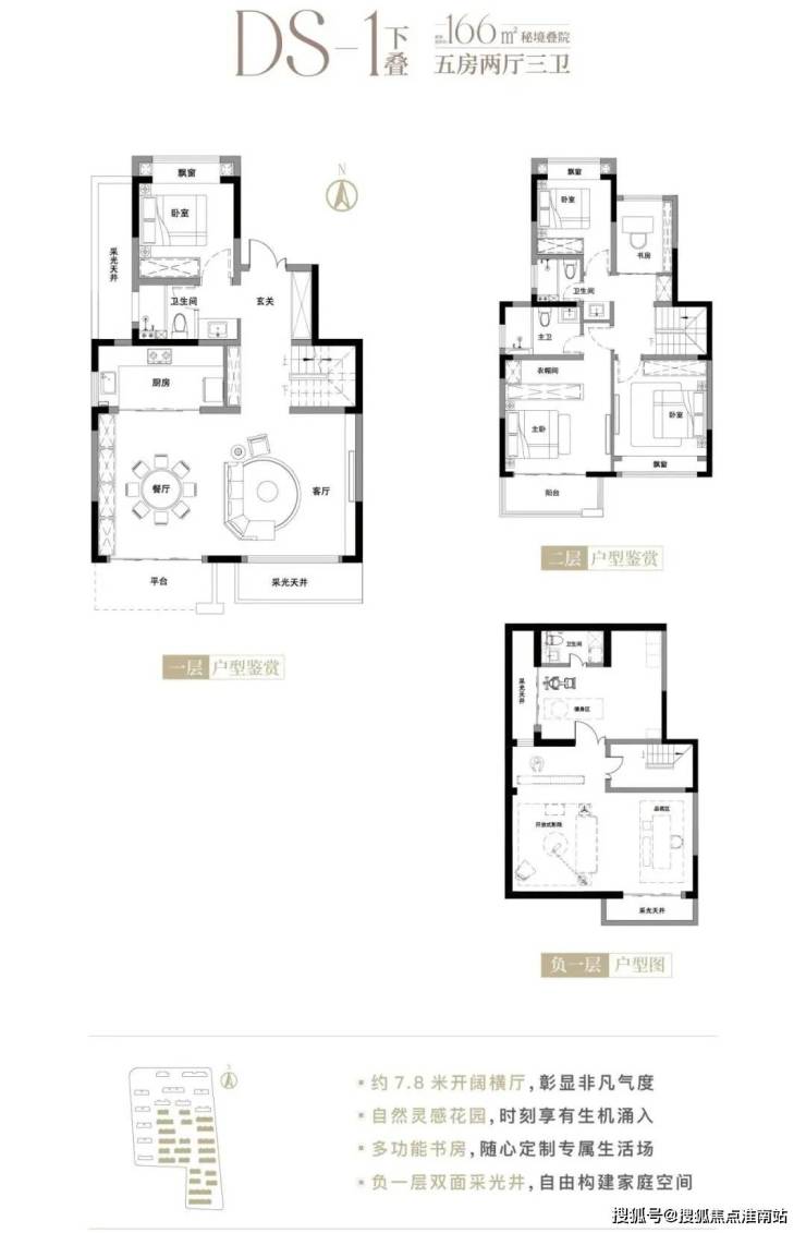 关注户型设计,约166平五房下叠,一层为餐客厅搭配老人房,二层为三卧室+书房,功能区分错落有序;