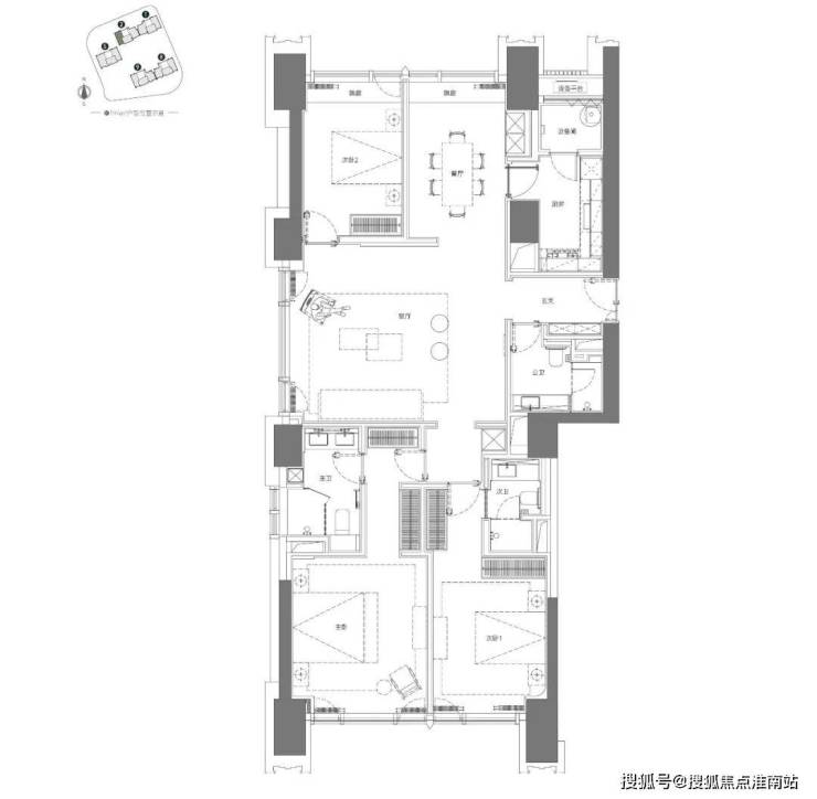 南侧两个套间,尺度感拉满,主卫明卫、做了双台盆设计。南次卧也同样是套间设计。玄关设置玄关柜增加室内收纳空间,考虑的很周到。