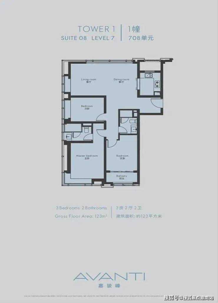 嘉骏峰建面约123㎡户型设计,以科学合理的分区规划, 打造3室2厅2卫的品质空间。