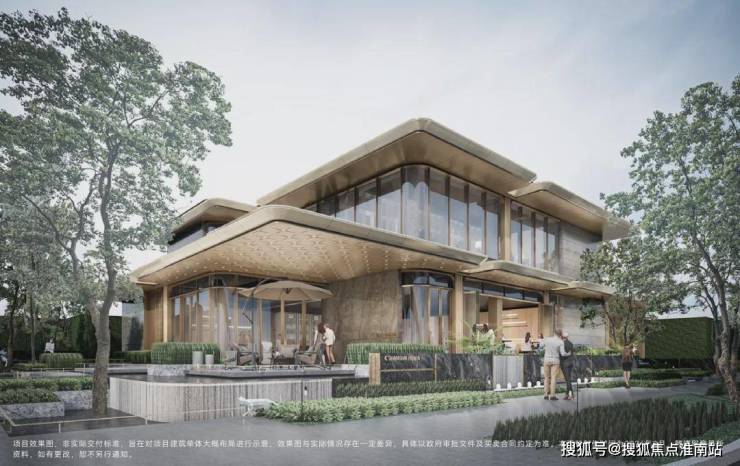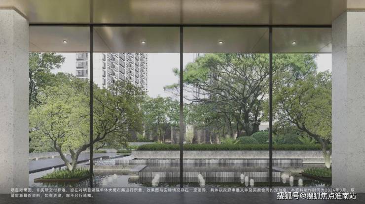 第一重——酒店式环道落客、现代精奢大堂、悬廊叠瀑水岸会客厅,移步异景,漫游归家入户;