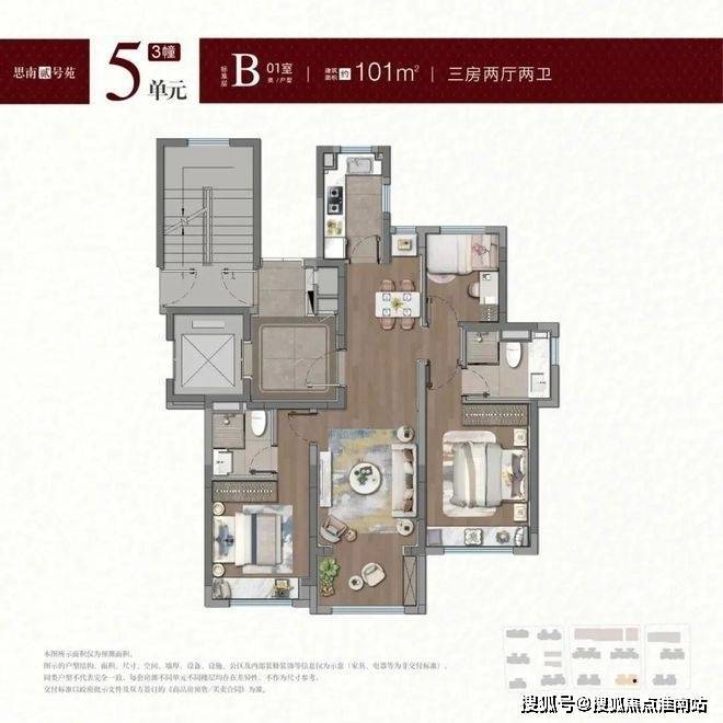 建面约100-101㎡户型,拥类独立电梯厅,无连廊+飞机户型南北通透。