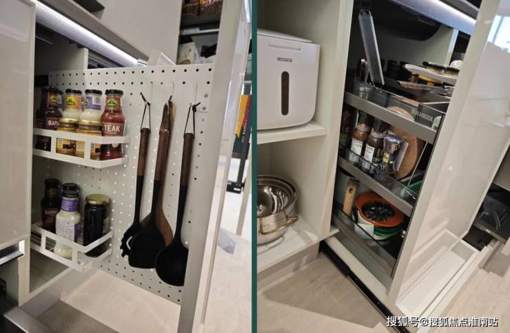 油烟机的两侧,也做了收纳,并且分了2层,提升了实用度。