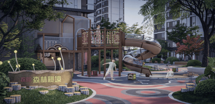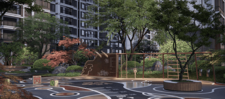 项目采用三段式入户:一进辋川入画(主入口空间),二进:闲庭碎影(戏台庭院),三进:临风听湖(自然庭院)。入户大门屋顶采用唐代“重檐歇山顶”形式配上台基上的唐代建筑标志阑干,入院后有一副唐风画作,其次以亭台楼榭、理水叠山的中国园林意境,重现盛唐大明宫百花争艳,小桥流水,落叶如金的景观。社区景观层层递进,让住户置身其中,体验唐风山水。
