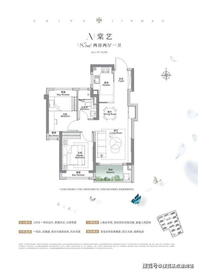 建面约85㎡2房2厅1卫,做到了双开间朝南+3个飘窗+LDKB一体化设计,附加空间非常多。