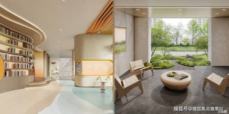 结合建筑、空间、自然环境关系,室内室外联动,呈现一个景观会客、海浪书屋、儿童休闲等多重功能的泛会所架空层,为全龄社交营造一个“有温度、有态度”的邻里空间。