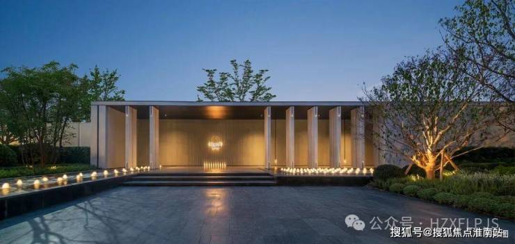 项目为打造公园里的好房子,南侧主动退让城市道路最远处约50m,打造约3500m²一重园景观,包含【登门望璟】门庭、【列柱中庭】塘岸游廊、【曲院泊风】奢级礼制车马院、【浮光春晓】下沉式庭院等四境。