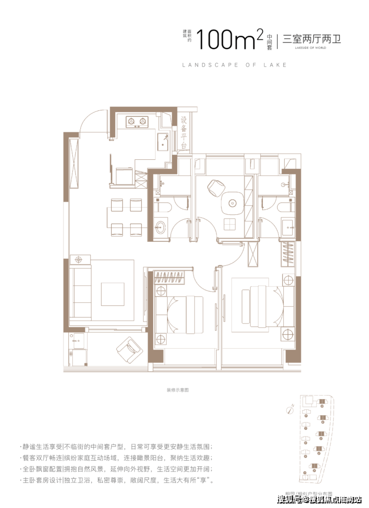建面约100㎡3房2厅2卫,做到了三开间朝南+主卧套房设计+动静分离+全卧室带飘窗,功能性和尺度感完美结合的3房户型。