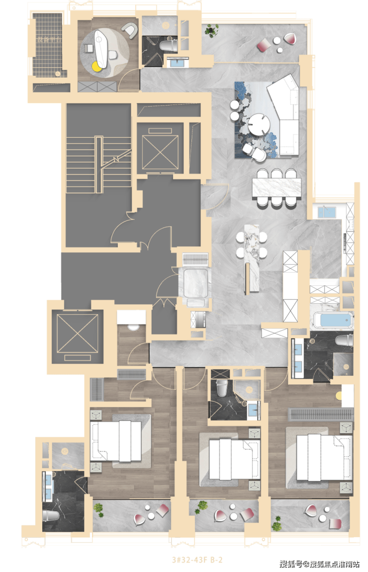 尤其主卧星级套房,配置独立衣帽间、书房,奢华主卫四分离,双台盆+淋浴区+大浴缸+智能马桶,私密性&奢适度无敌;