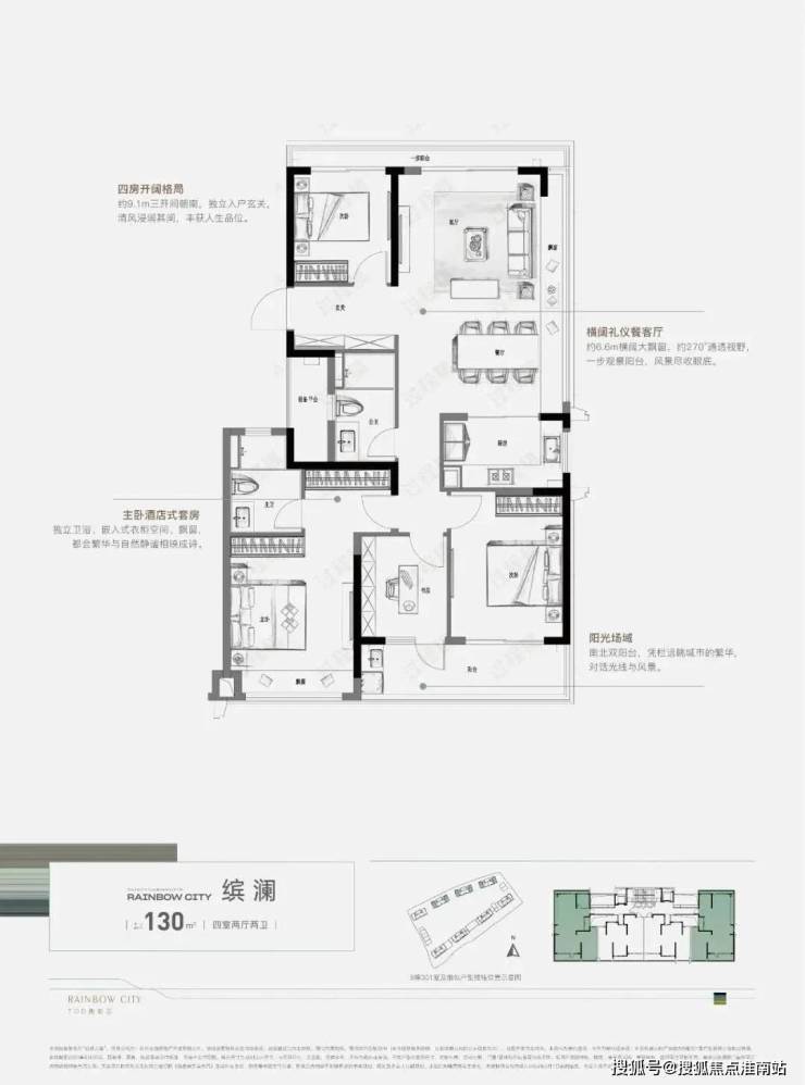 而建面约130㎡户型,在纯边套、约270°环景视野的基础上,餐客厅配以约6.6m横阔大飘窗、一步朗阔阳台,瞰景收心,释放恬淡自在的情绪。约9.1m三开间朝南,约5.6m双联阳台,无限扩展生活意境,园林芳华尽现眼前。一方阳台亦可作为私人天地,一台跑步机或瑜伽垫,即刻打造一个健身房;一副休闲桌椅,亦可感受生活的自如惬意