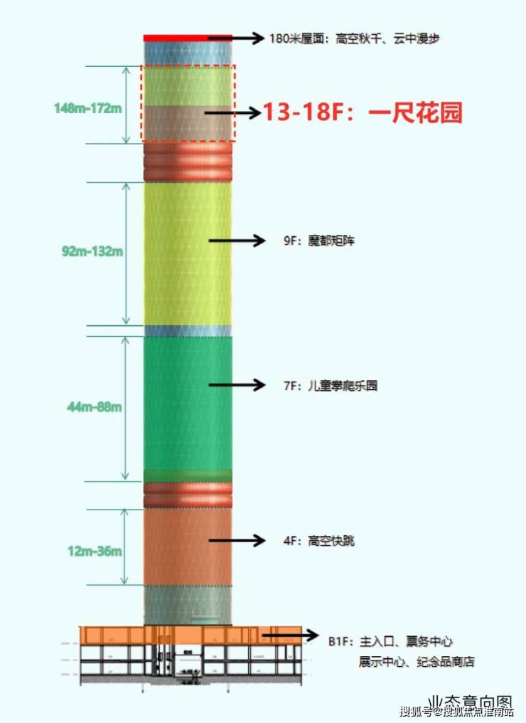 除了13-18楼的一尺花园餐厅,长滩风塔148米以下(4楼、7楼、9楼)还规划有亲子游乐项目,增强长滩风塔的娱乐休闲功能;塔顶屋面拟设置极限挑战类项目,以增加风塔的对外曝光度和文旅体验感。