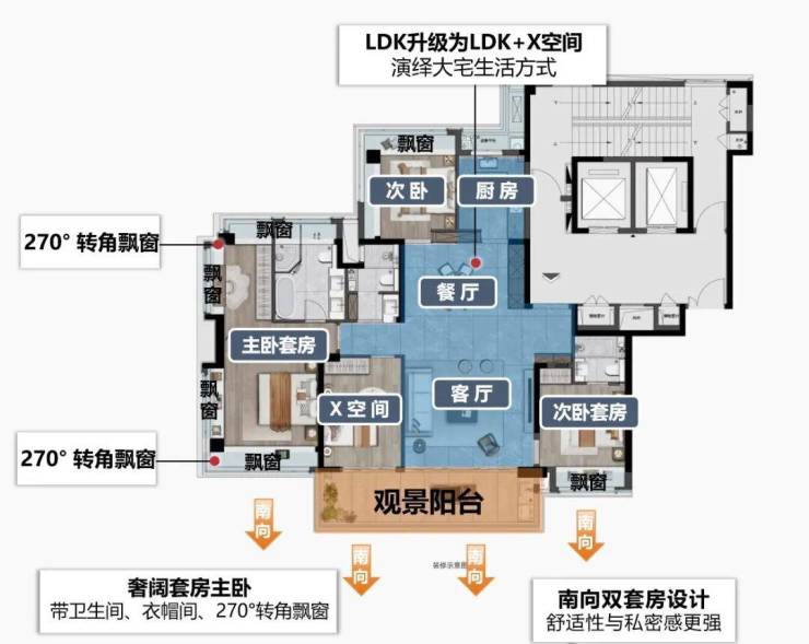 部分户型主卧套房、北向次卧采用270°环幕式转角飘窗设计,双面采光扩大了室内的采光视野;部分户型北次卧还是罕见双飘窗设计,大大增加使用率和室内采光。