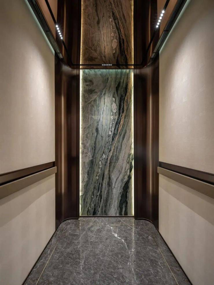 还有首层轿厢内电梯门也特别做了定制细节处理,使用金属蚀刻工艺不锈钢电梯门,高定专属纹案,近看能摸到细腻的凹凸质感;电梯厅内采用维多利亚绿奢石和温德姆灰石材打造,匹配类独厅设计的归家尊仪……奢石大量运用于公区,与超级豪宅相比都毫不逊色。