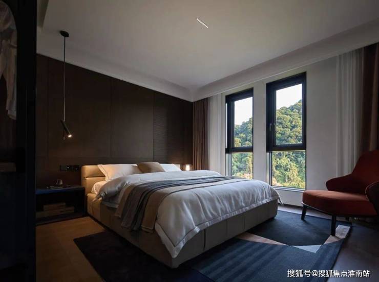 艺术感不仅体现在空间环境的营造,细节的处理和材质的选择也透漏出时尚气息。大气中又不失生活的趣味。皮质有纹理的软包,无主灯的设计,每一处细节都体现着轻奢感。地毯、床品和吊灯的相互映衬,营造出自然舒适的空间氛围,增添了卧室的温暖气息。