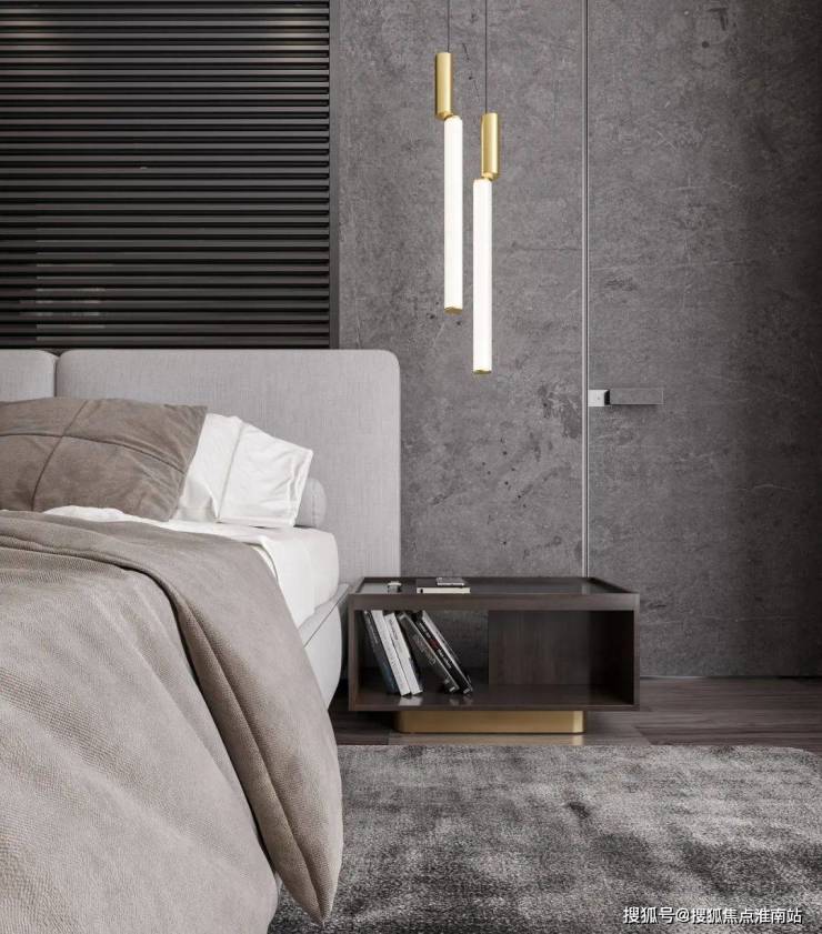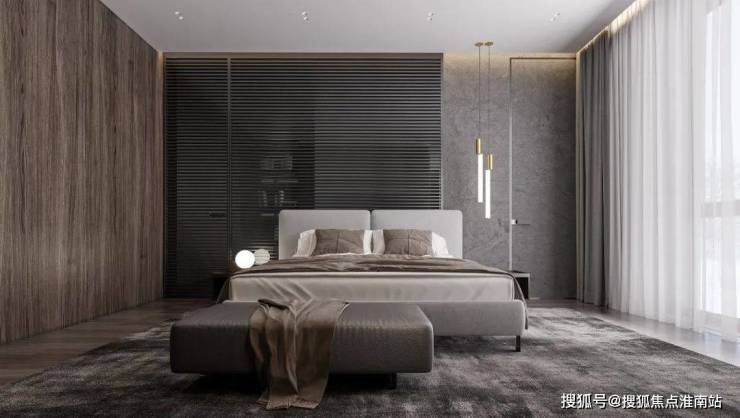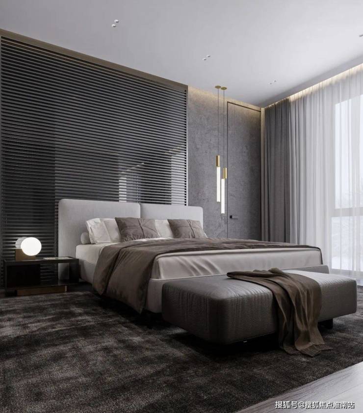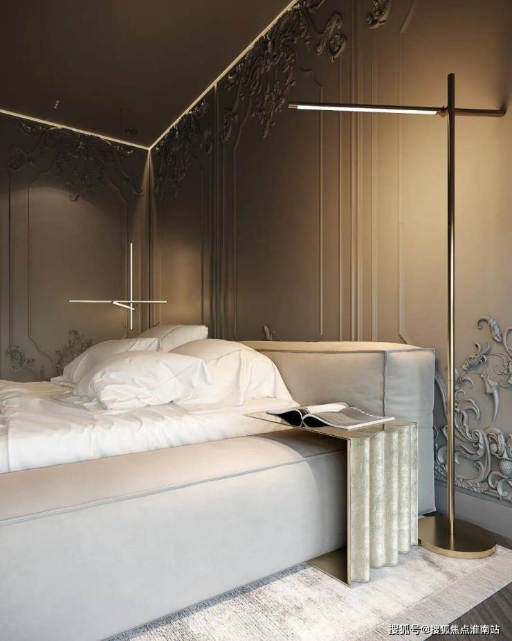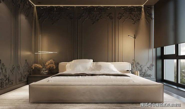 以石膏线护墙为视觉重心,与木地板交叠,纵横有序的线条延展,勾勒出精致的卧室空间,浅灰调床品从中调和,落地窗将室外光线带入,整个画面保持着奢美、沉稳的气质。