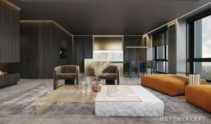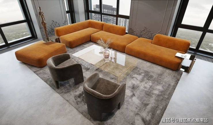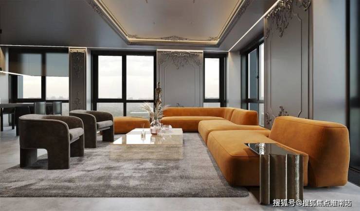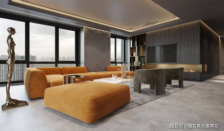 以优雅为主题的客厅空间,一抹亮眼的橙色,打破宁静,为空间注入活力欢快的气息,从天花板一直蔓延到墙面的石膏线条,与抽象艺术摆件,将轻奢气息渲染到极致。