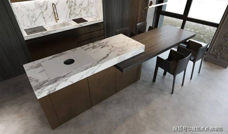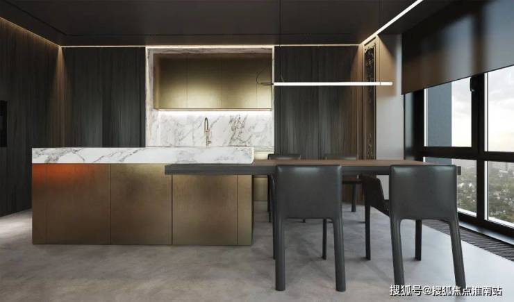 转入餐厨空间,柚木铺垫的橱柜系统,与电视柜相呼应,奠定了舒缓柔和的自然基调,岩板台面及金属饰面延伸至岛台、餐桌,纹理的交织,辅以高级灰的渲染,串联起温暖的生活记忆。