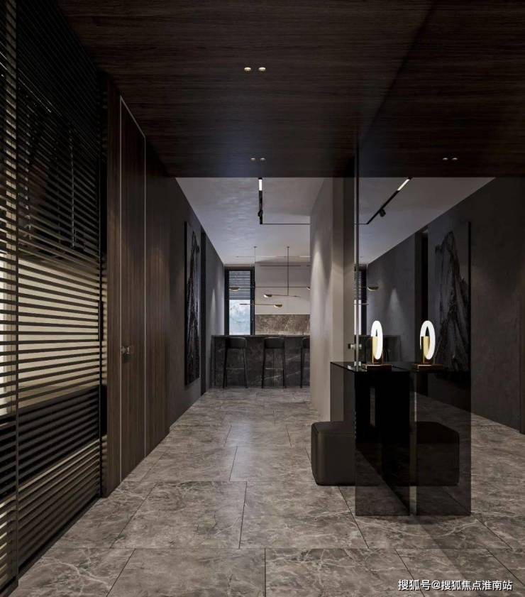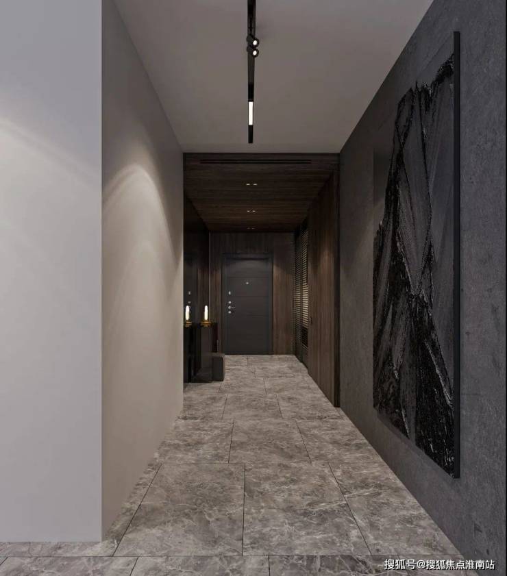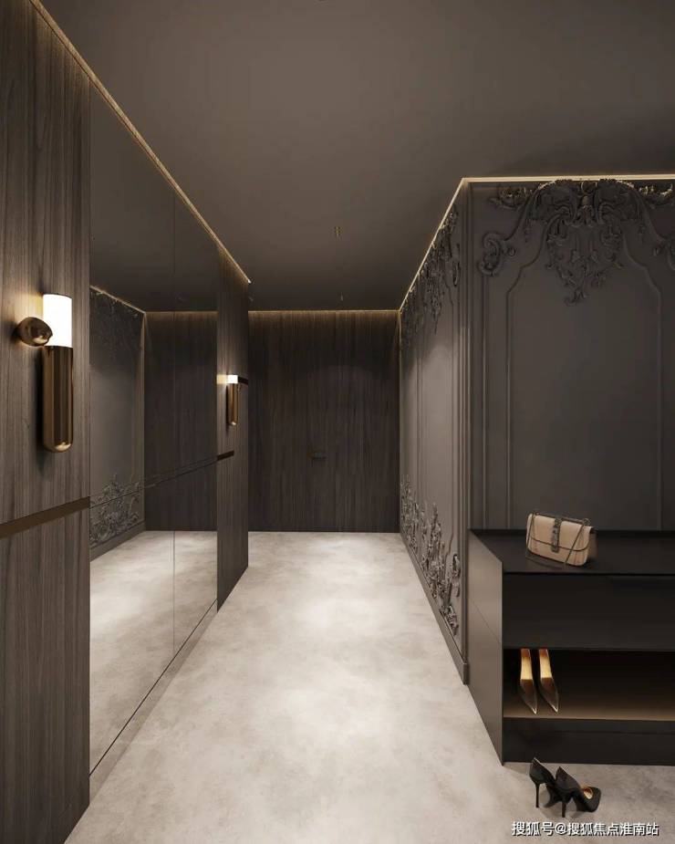 简洁大气的门厅空间,以高级灰作为主色搭配,大面积镜子、柚木护墙的铺设,减少了长过道的沉闷无趣,优雅的石膏线勾勒出古典层次,叙说出奢美的生活状态。