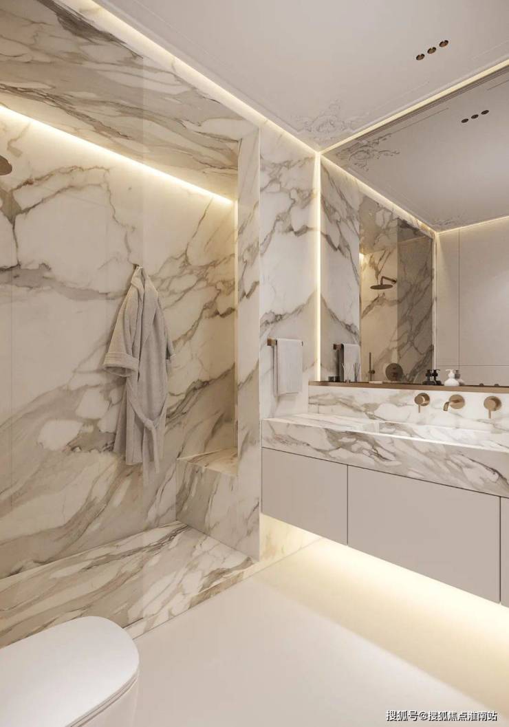 大面积的岩板铺设,带来了清爽而明朗的空间视野,将简与雅的独特气质更淋漓地展现,洗漱柜采用吊柜形式,无把手的立面,简致化的切割,流露出干练、简奢的美感。