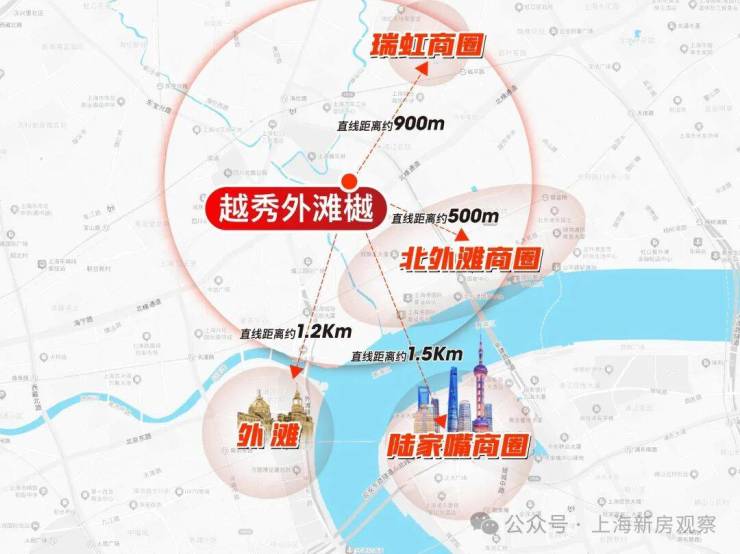 越秀外滩樾直线距离外滩源仅约1.2公里,直线距离北外滩商圈约500米,直线距离瑞虹商圈约900米,直线距离陆家嘴商圈约1500米!